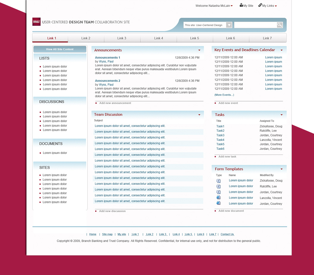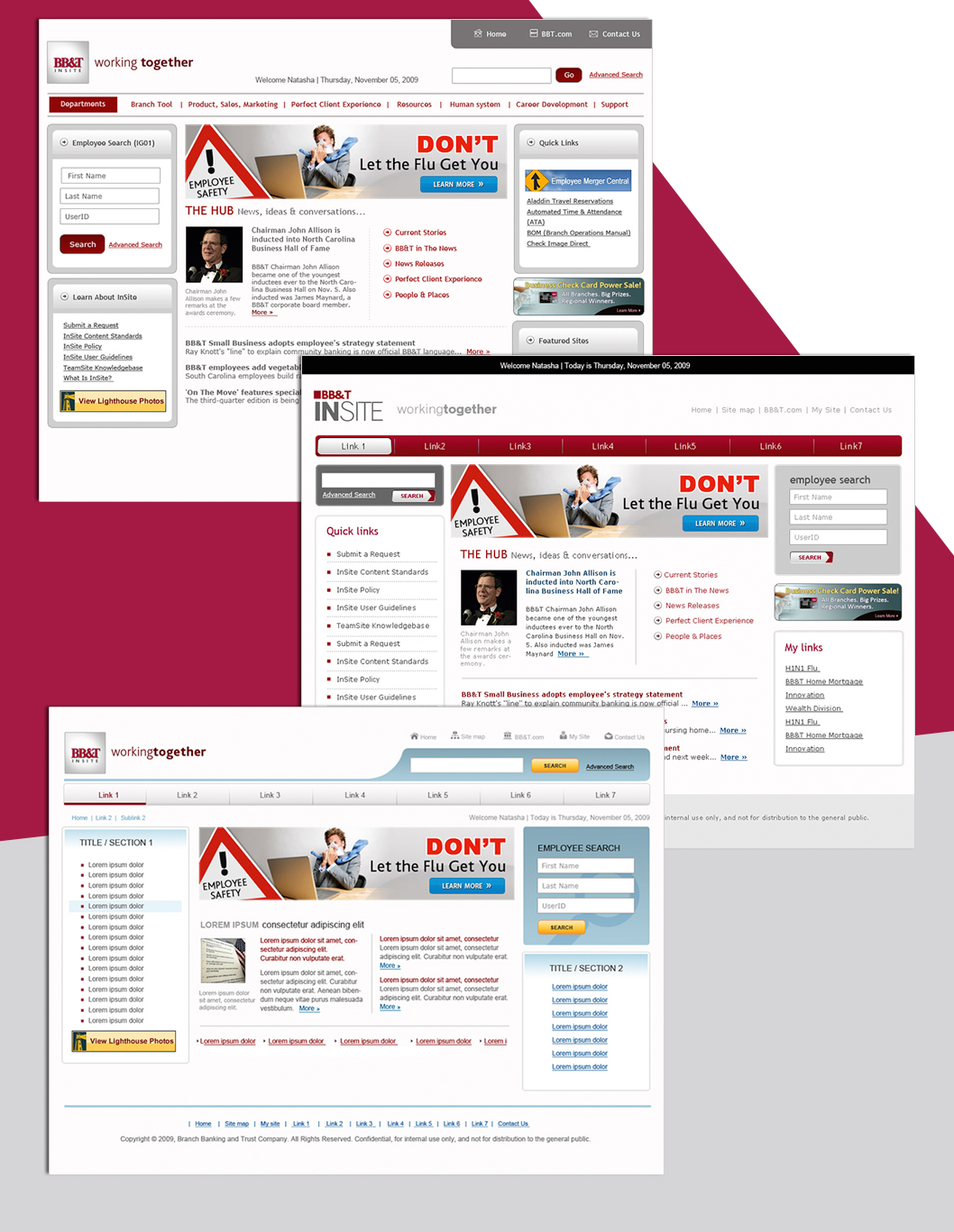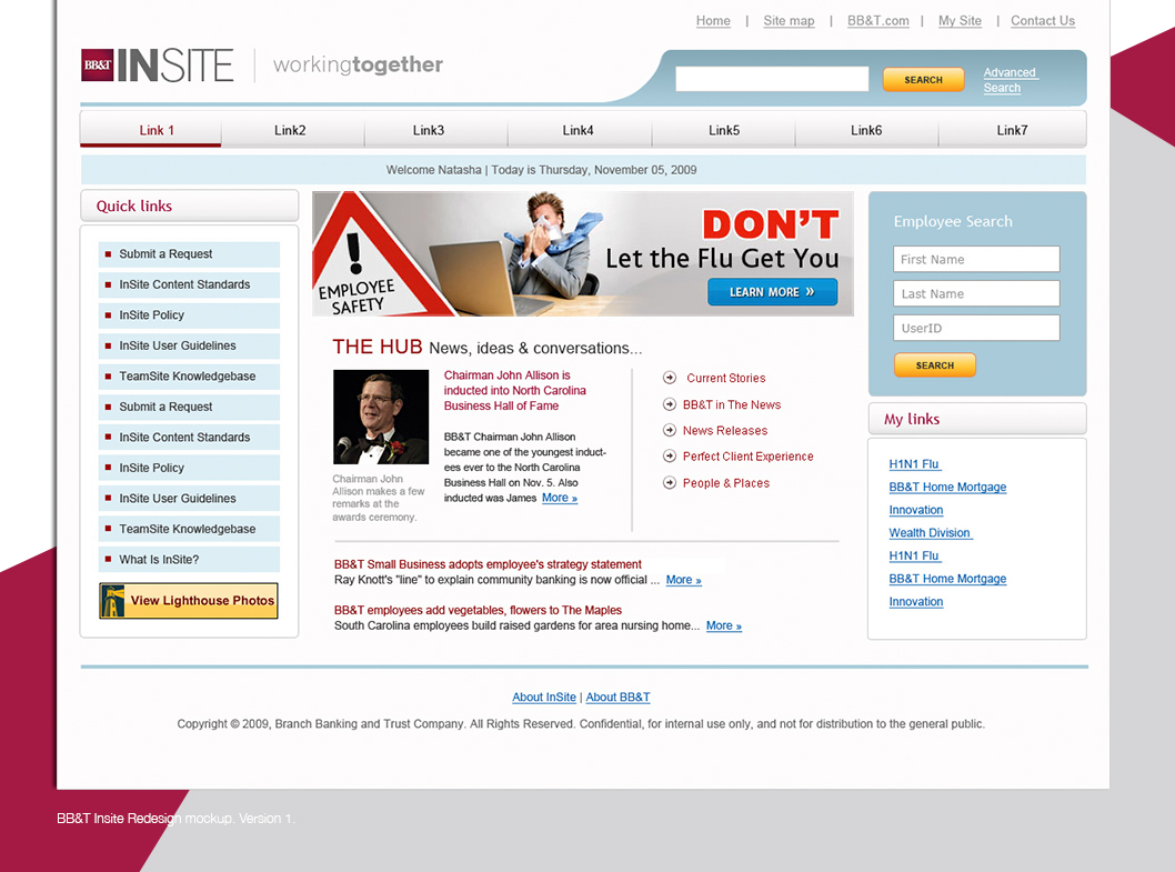 The purpose of this project was to redesign the BB&T Intranet website (the internal website for BB&T employees). The goal was to make the website look and feel more modern and user friendly, and also more responsive and suitable for mobile devices.