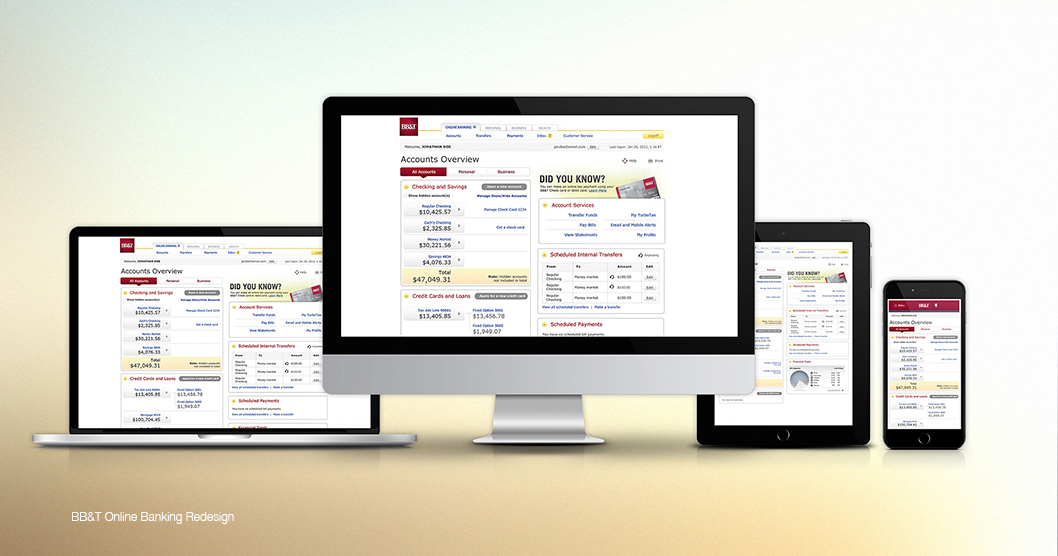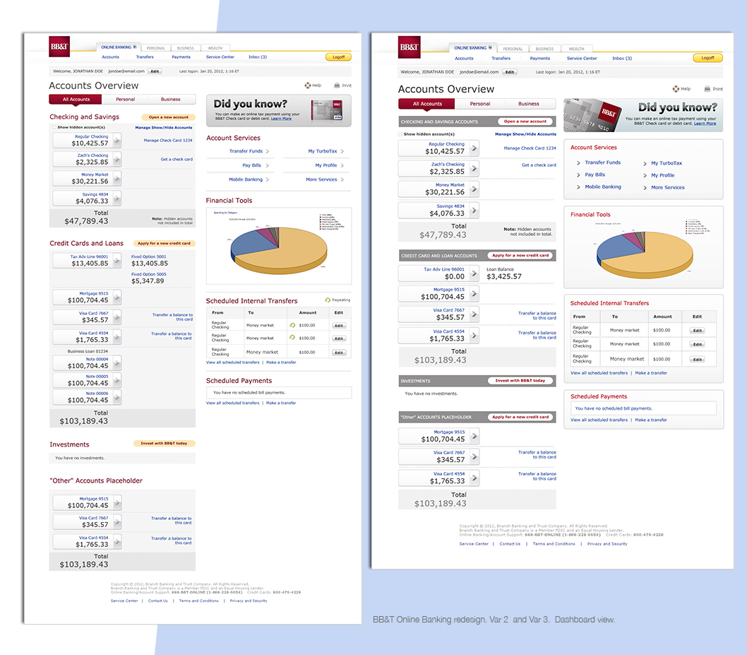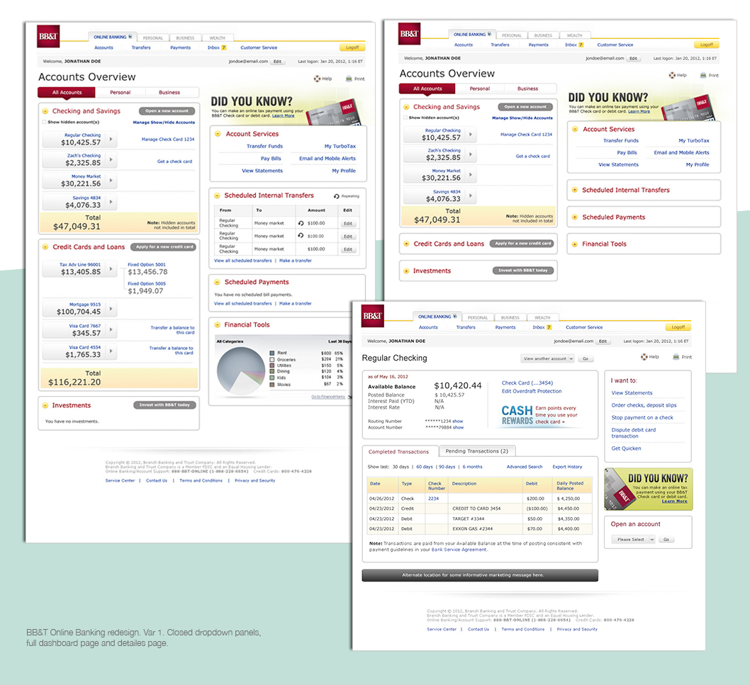 Re-design existing online banking pages. Make them look and feel more modern and user friendly. Implement new financial services such as: linked accounts, credit score, bill pay, transfers, and financial tools. Make those pages responsive and suitable for mobile devices.